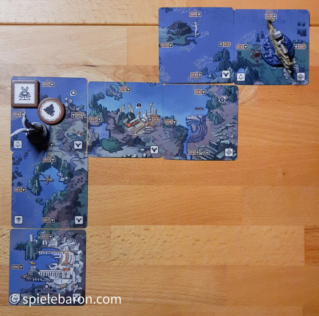 Haben wir auf einem neuen Kartenteil, oder in der Timeline (sie bildet einen zweiten Timer, den es im Spiel zu schlagen gilt), oder durch den Fortschritt eines unserer Charaktere (es gibt immer vier Argonauten, die von den Spielern unabhängig von der Spielerzahl bedient werden) einen Story-Effekt ausgelöst, dann starten wir eine Adventure: