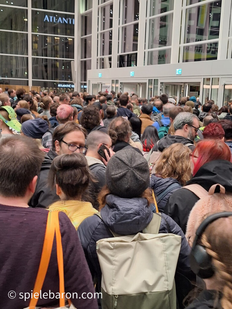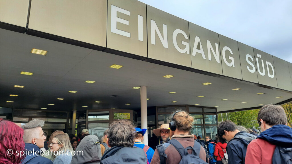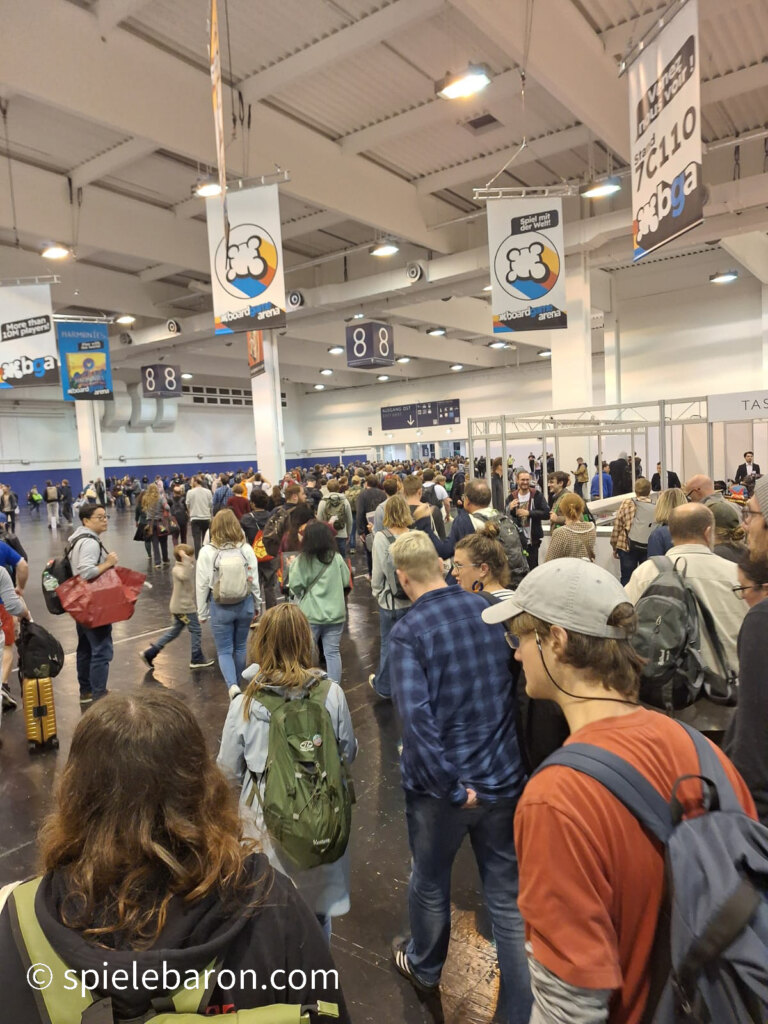Ich hatte den Eindruck, dass an diesem Tag wirklich alles zusammen kommt: Die Neuheiten- und Schnäppchenjäger, die so früh wie möglich an ihre Lieblingsstände kommen wollen, bevor ihre Lieblingstitel ausverkauft sind. Die Bummler, die sich alles auf einmal anschauen wollen. Die Langzeitbesucher (wie wir), die Leute, die sich sofort in alle Listen eintragen, um möglichst viele Spiele an einem Tag spielen zu können…