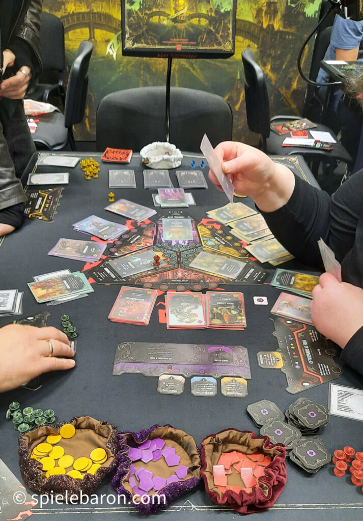 Alle drei Spiele haben uns wirklich gut gefallen! – Und doch haben wir letztlich keines davon gekauft. Warum? Weil das eine sehr ähnlich wie Dominion ist (was wir haben und spielen), das andere sich fast so spielt wie Ascension (das ich besitze, aber bisher nur online gespielt habe), und das dritte hat so viele Varianten – ich konnte mich nicht entscheiden und hab mich erinnert, dass ich nicht unbedingt etwas kaufen muss, auch wenn es mir gefällt. (Wow! Ja, tatsächlich, ich habe gelernt mich zurückzuhalten!)